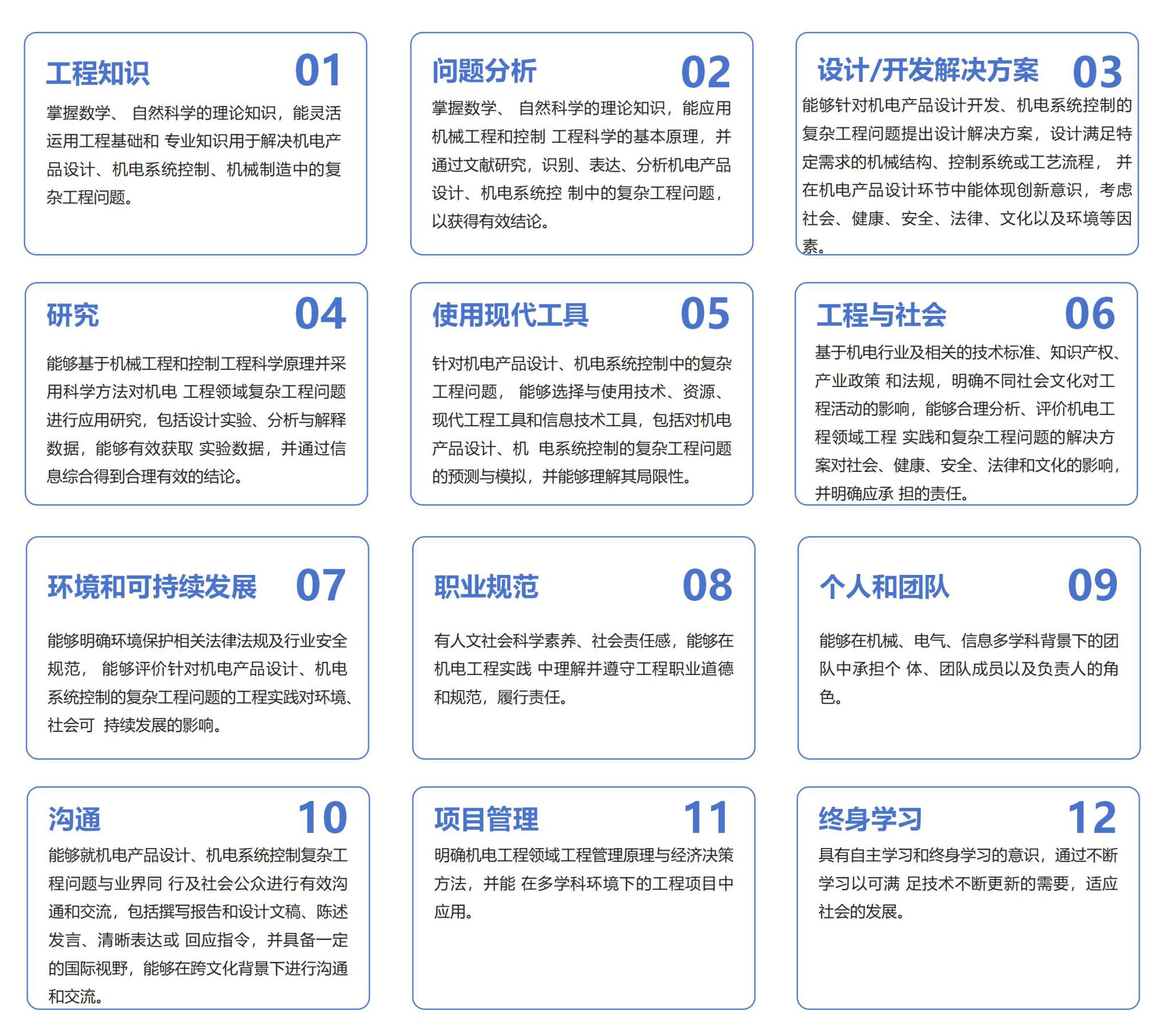 能力目标:具备机电一体化系统设计、开发与集成能力(涵盖机械结构、电子硬件、控制软件及工业网络);能够独立解决智能装备、新能源汽车、半导体设备等领域的复杂工程问题,并实现跨领域技术融合与应用。