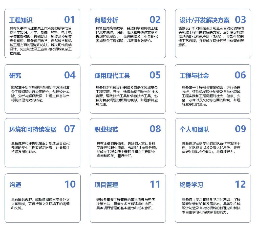 具备智能装备的设计与开发能力(机械结构、自动化控制、优化算法)。能解决智能装备、工业机器人、高档数控机床、数字化设计与制造、智能汽车等领域的工程实际问题。